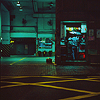 Description: blue-tinged empty building lit by fluorescent light